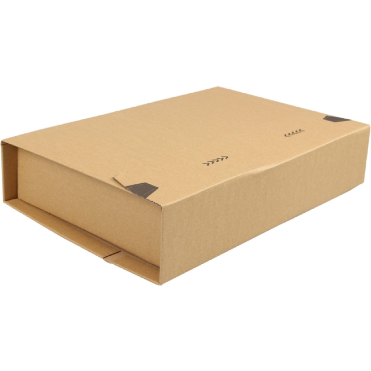 De boekverpakking van golfkarton wordt plat en dus ruimtebesparend geleverd. Inpakken gaat snel en eenvoudig: kies het geschikte formaat, leg de inhoud erin en breng de binnenzijde met behulp van de rillijnen zelf op de gewenste hoogte. Wikkel de verpakking dan rondom de inhoud en sluit de wikkeldoos snel en stevig af met de zelfklevende afsluitstrip. Vulmateriaal en tape heb je niet nodig.
