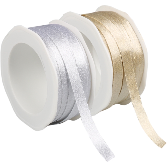 Dit luxueuze, matglanzende satijnlint is in twee breedtes verkrijgbaar in een zilverkleurige en een goudkleurige variant. Gebruik ze als decoratie op een stijlvolle kerstverpakking en maak er elegante strikken mee. Het soepele cadeaulint zit op een smalle spoel en laat zich heel gemakkelijk verwerken.